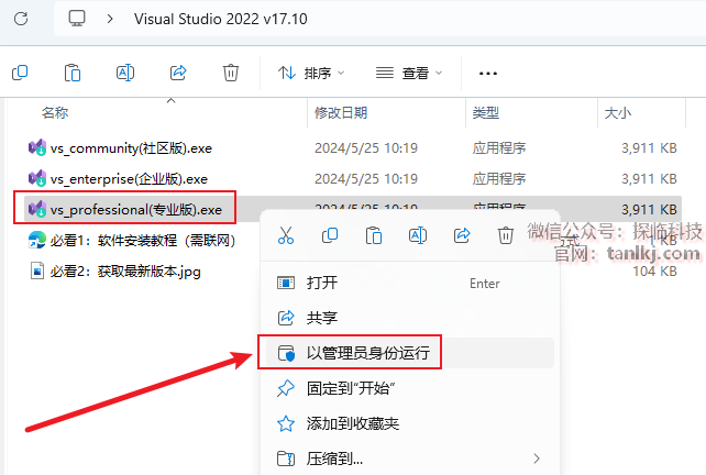 打开解压后的文件夹,右键程序【vs_professiona(专业版)】,点击【以管理员身份运行】。