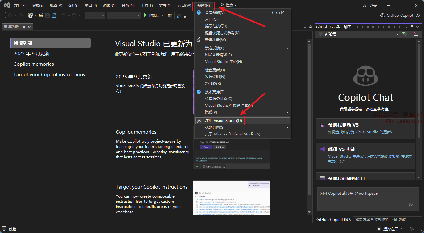 点击菜单栏中的【帮助】,点击【注册 Visual Studio】。