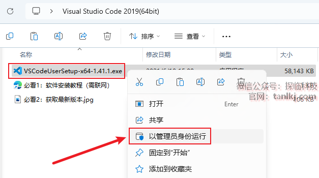 打开解压后的文件夹,右键程序【VSCodeUserSetup…】,点击【以管理员身份运行】。