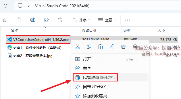 打开解压后的文件夹,右键程序【VSCodeUserSetup…】,点击【以管理员身份运行】。