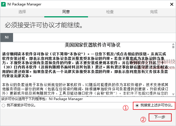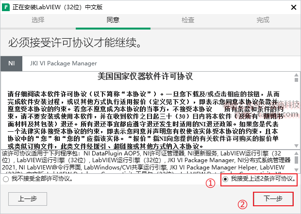①勾选【我接受上述2条许可协议】;
