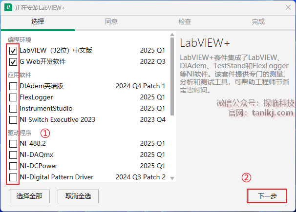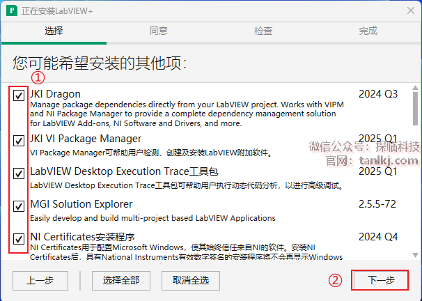 ①勾选需要安装的组件;