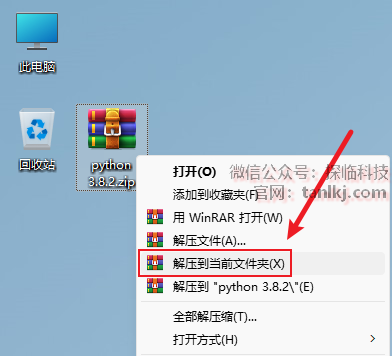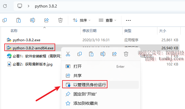 打开解压后的文件夹,右键程序【python-3.8.2-amd64】(32位系统运行第一个,64位系统运行第二个),点击【以管理员身份运行】。