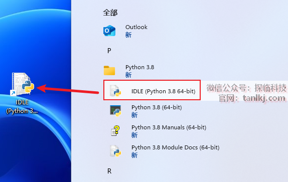 找到软件【IDLE(Python 3.8 64-bit)】,并将其拖至桌面创建快捷方式。