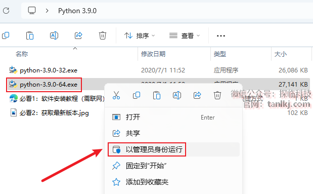打开解压后的文件夹,右键程序【python-3.9.0-amd64】(32位系统运行第一个,64位系统运行第二个),点击【以管理员身份运行】。