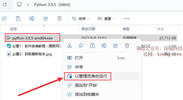 打开解压后的文件夹,右键程序【python-3.9.5-amd64】,点击【以管理员身份运行】。