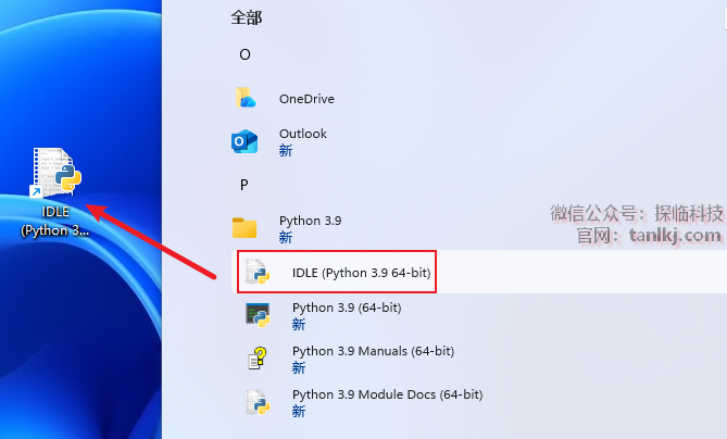 找到软件【IDLE(Python 3.9 64-bit)】,并将其拖至桌面创建快捷方式。