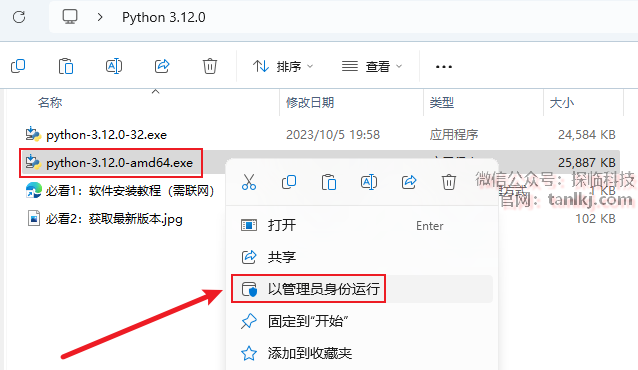 打开解压后的文件夹,右键程序【python-3.12.0-amd64】(32位系统运行第一个,64位系统运行第二个),点击【以管理员身份运行】。