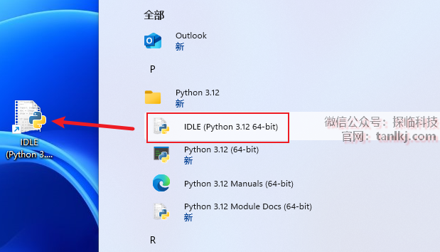 找到软件【IDLE(Python 3.12 64-bit)】,并将其拖至桌面创建快捷方式。