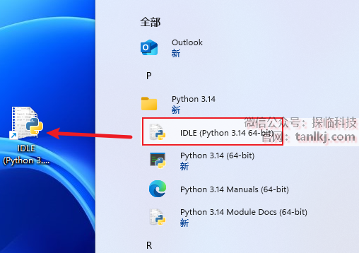 找到软件【IDLE(Python 3.14 64-bit)】,并将其拖至桌面创建快捷方式。
