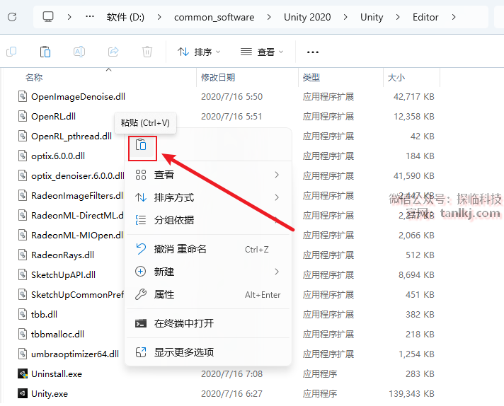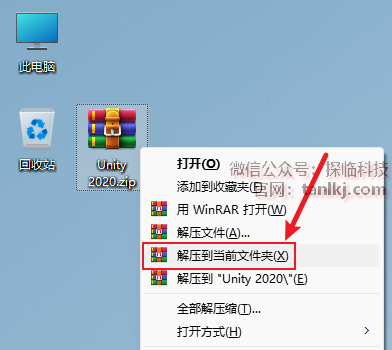 在桌面,右键软件【Unity 2020.1.0…】,点击【打开文件所在的位置】。
