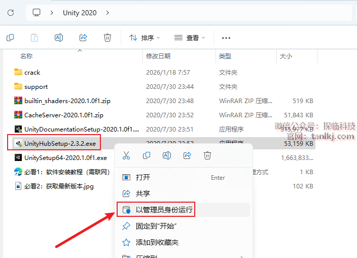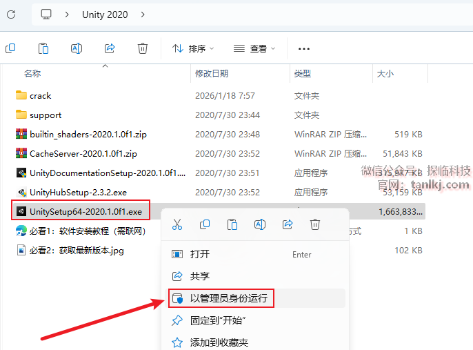 打开解压后的文件夹,右键程序【UnitySetup64-2020.1.0f1】,点击【以管理员身份运行】。