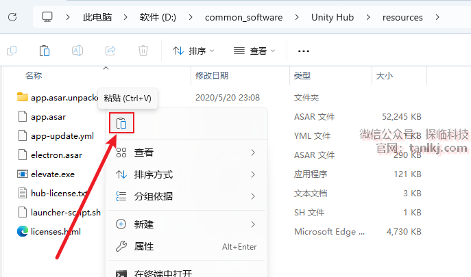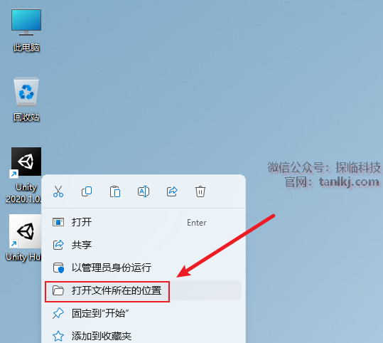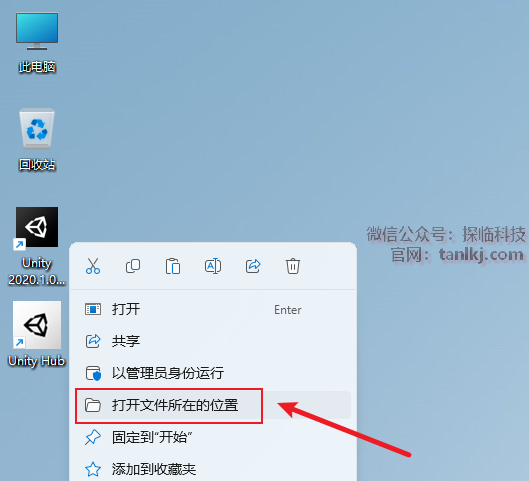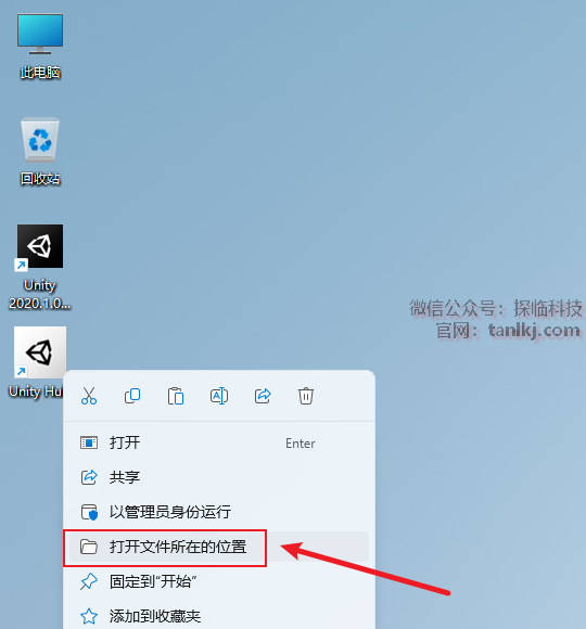 在桌面,右键软件【Unity Hub】,点击【打开文件所在的位置】。