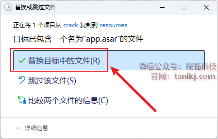 点击【替换目标中的文件】。