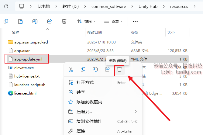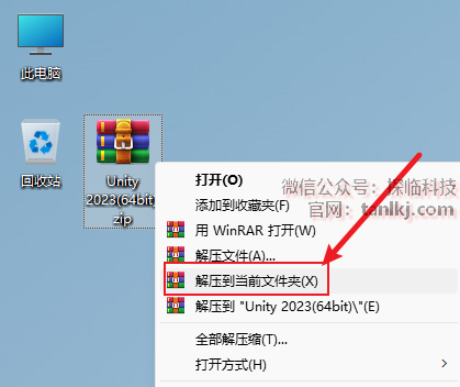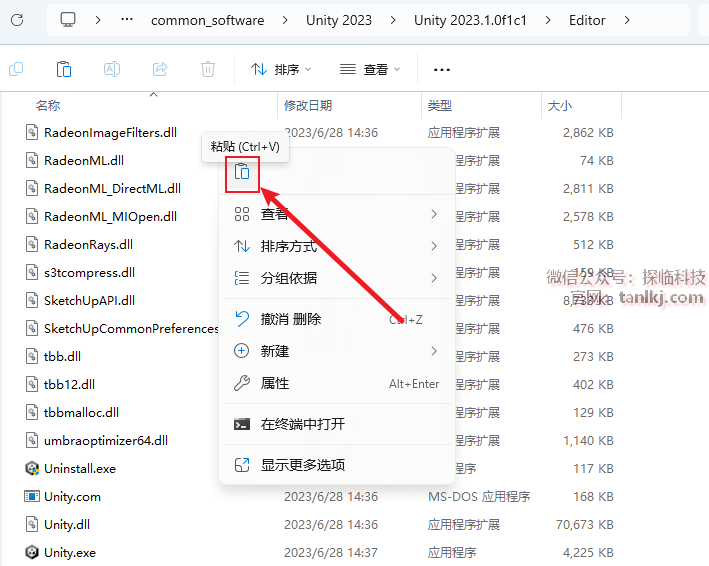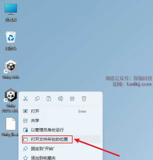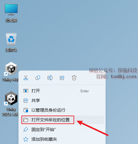在桌面,右键软件【Unity 2023.1.0…】,点击【打开文件所在的位置】。