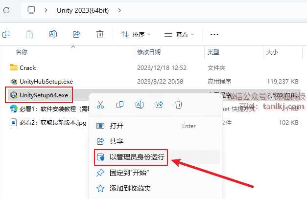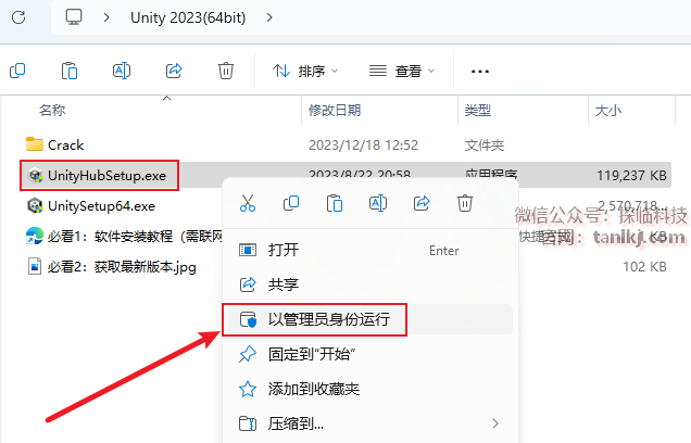 回到之前解压后的文件夹中,右键程序【UnitySetup64】,点击【以管理员身份运行】。