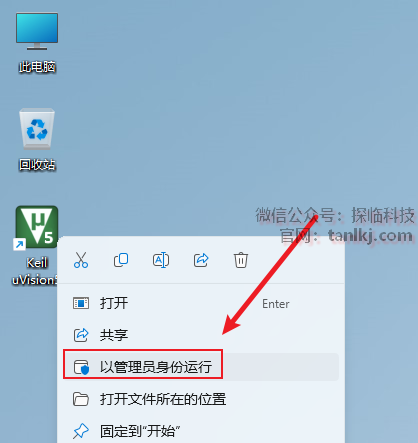 在桌面,右键软件【Keil uVision5】,点击【以管理员身份运行】。