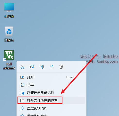在桌面,右键软件【Keil uVision5】,点击【打开文件所在的位置】。