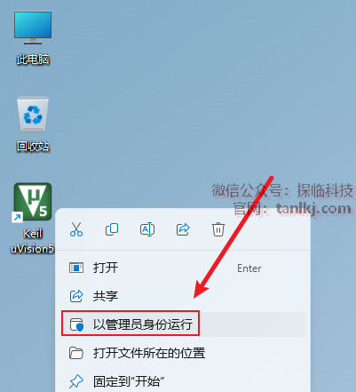 在桌面,右键软件【Keil uVision5】,点击【以管理员身份运行】。