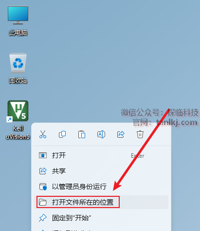 在桌面,右键软件【Keil uVision5】,点击【打开文件所在的位置】。