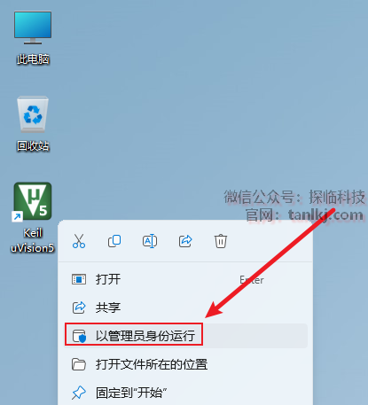 在桌面,右键软件【Keil uVision5】,点击【以管理员身份运行】。