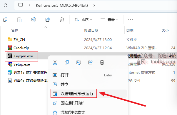 回到之前解压后的文件夹中,右键解压出来的程序【Keygen】,点击【以管理员身份运行】。