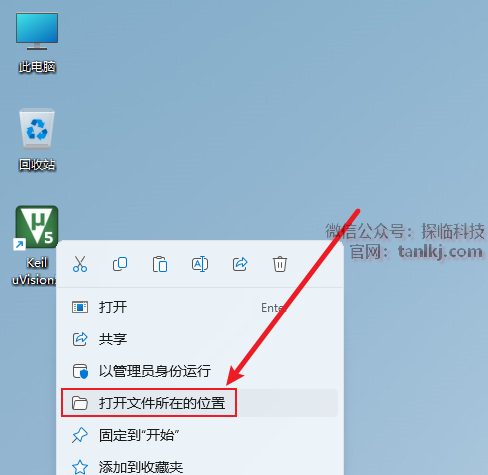 在桌面,右键软件【Keil uVision5】,点击【打开文件所在的位置】。