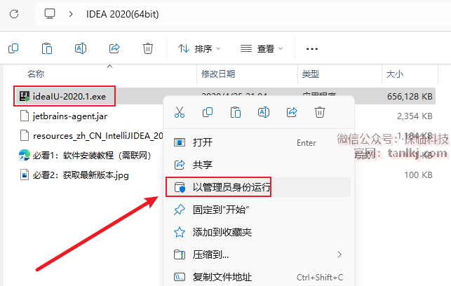 打开解压后的文件夹,右键程序【ideaIU-2020.1】,点击【以管理员身份运行】。