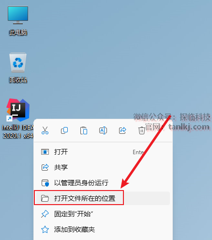 在桌面,右键软件【IntelliJ IDEA】,点击【打开文件所在的位置】。