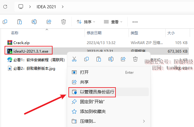 打开解压后的文件夹,右键程序【ideaIU-2021.3.1】,点击【以管理员身份运行】。