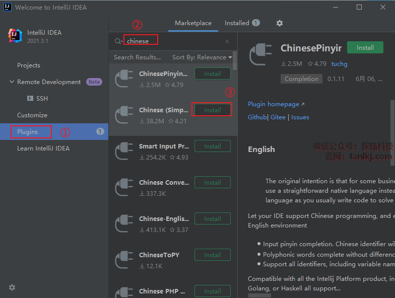 ③点击【Cinese(Simp…)】后的【Install】。