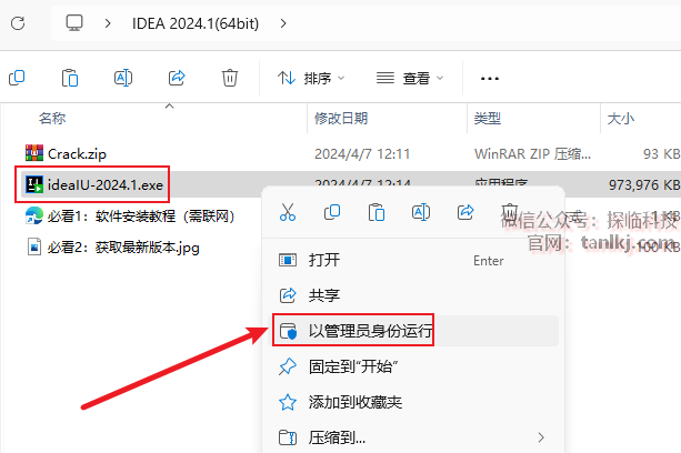 打开解压后的文件夹,右键程序【ideaIU-2024.1】,点击【以管理员身份运行】。