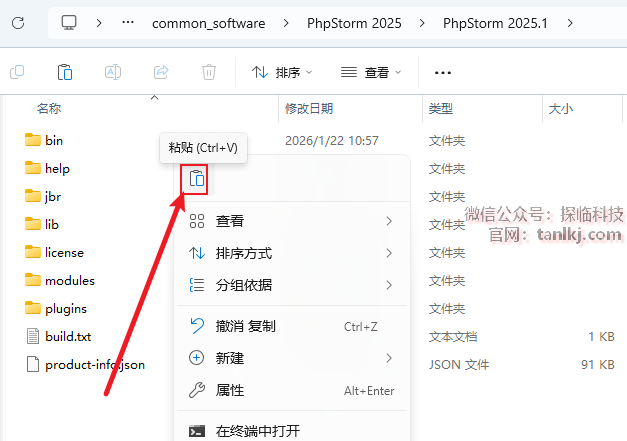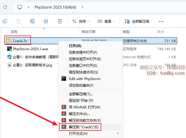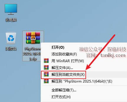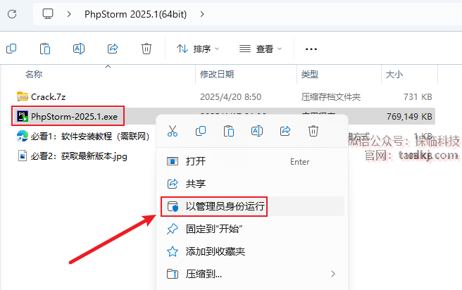 打开解压后的文件夹,右键程序【PhpStorm-2025.1】,点击【以管理员身份运行】。