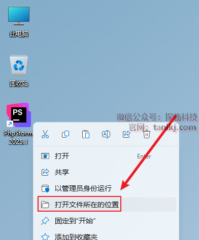 在桌面,右键软件【PhpStorm】,点击【打开文件所在的位置】。