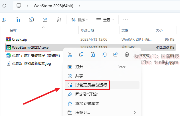 打开解压后的文件夹,右键程序【WebStorm-2023.1】,点击【以管理员身份运行】。