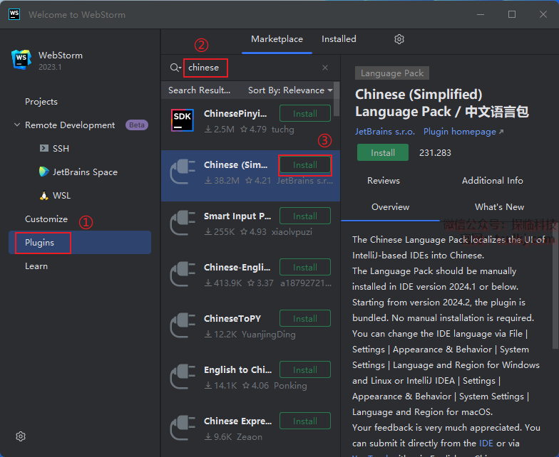 ③点击【Cinese(Simp…)】后的【Install】。