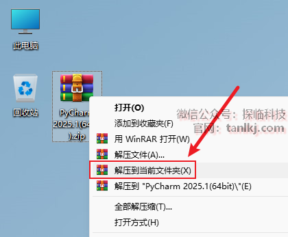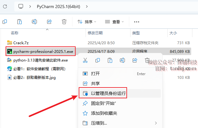 打开解压后的文件夹,右键程序【pycharm-professional-2025.1】,点击【以管理员身份运行】。