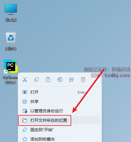 在桌面,右键软件【PyCharm】,点击【打开文件所在的位置】。