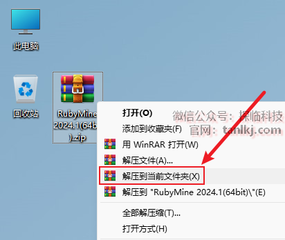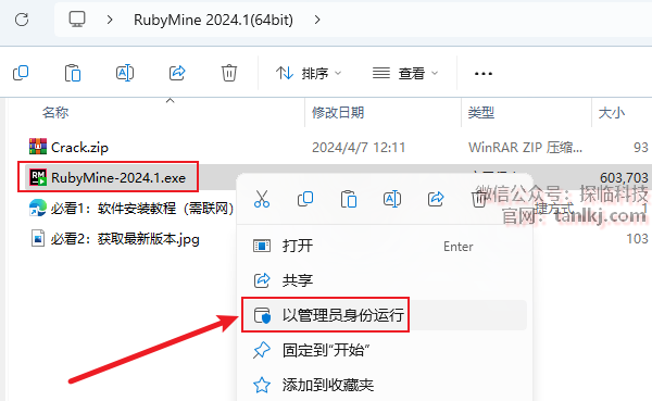 打开解压后的文件夹,右键程序【RubyMine-2024.1】,点击【以管理员身份运行】。