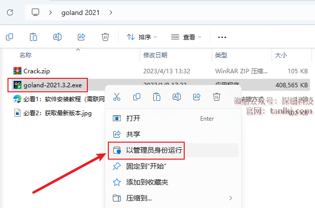 打开解压后的文件夹,右键程序【goland-2021.3.2】,点击【以管理员身份运行】。