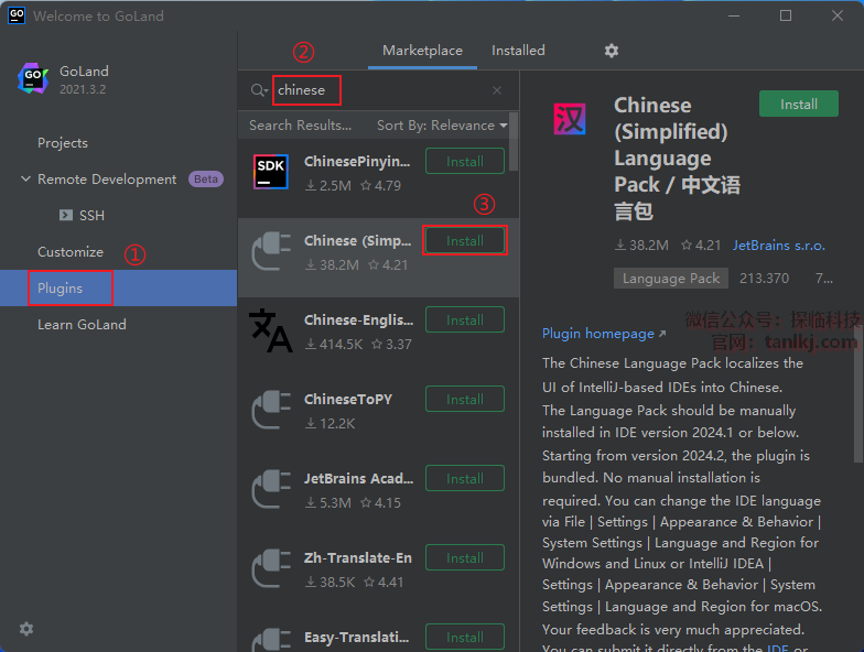 ③点击【Cinese(Simp…)】后的【Install】。