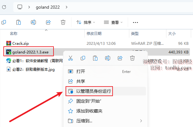 打开解压后的文件夹,右键程序【goland-2022.1.3】,点击【以管理员身份运行】。