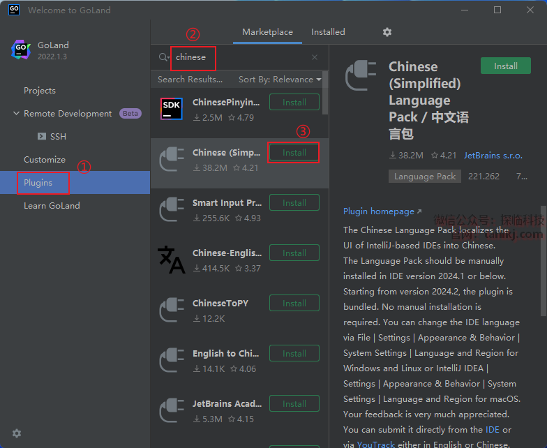 ③点击【Cinese(Simp…)】后的【Install】。