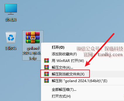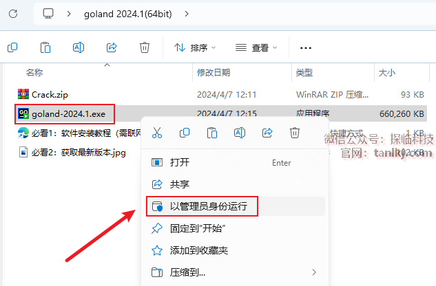 打开解压后的文件夹,右键程序【goland-2024.1】,点击【以管理员身份运行】。