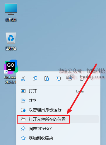 在桌面,右键软件【GoLand】,点击【打开文件所在的位置】。