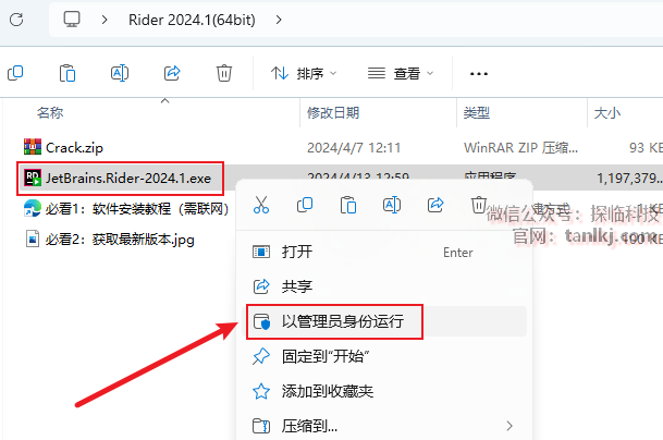 打开解压后的文件夹,右键程序【JetBrains.Rider-2024.1】,点击【以管理员身份运行】。