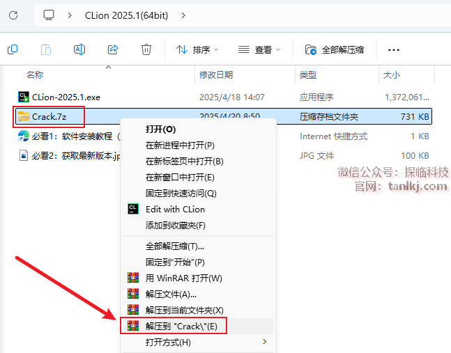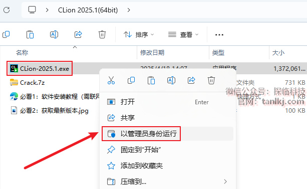 打开解压后的文件夹,右键程序【CLion-2025.1】,点击【以管理员身份运行】。