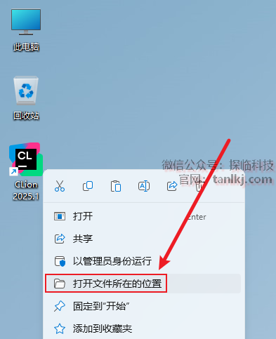 在桌面,右键软件【CLion】,点击【打开文件所在的位置】。