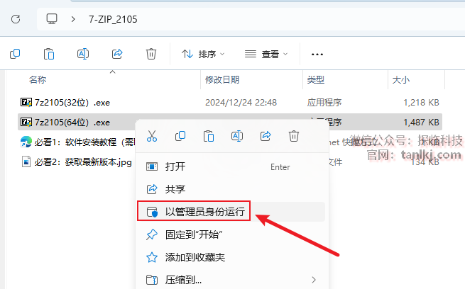 右键程序【7z2105(64位)】,点击【以管理员身份运行】。