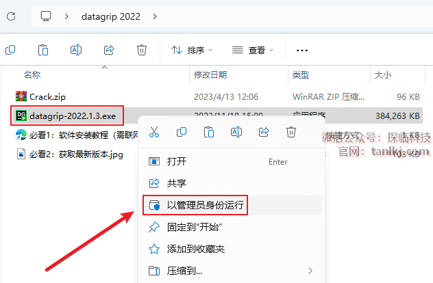 打开解压后的文件夹,右键程序【datagrip-2022.1.3】,点击【以管理员身份运行】。